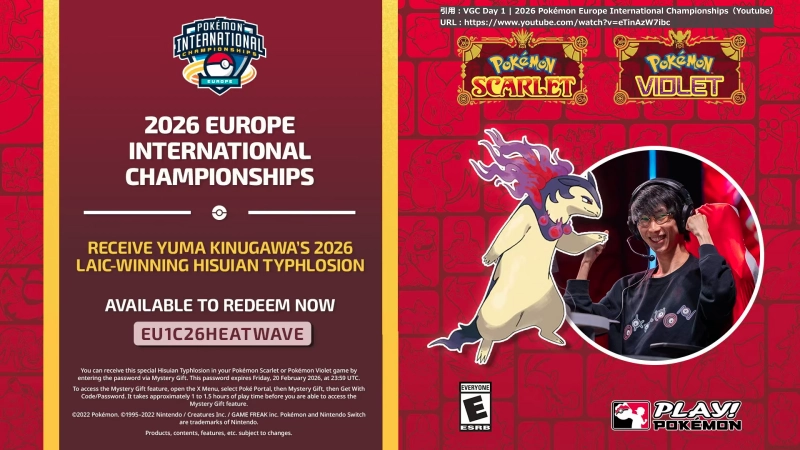 イギリス・ロンドンで開催されるヨーロッパ インターナショナル チャンピオンシップス2026(Pokémon Europe International Championships 2026)を記念して、ラテンアメリカ大会2026で優勝したキヌガワ選手の「バクフーン(ヒスイの姿)」がもらえるあいことばが公開されました。