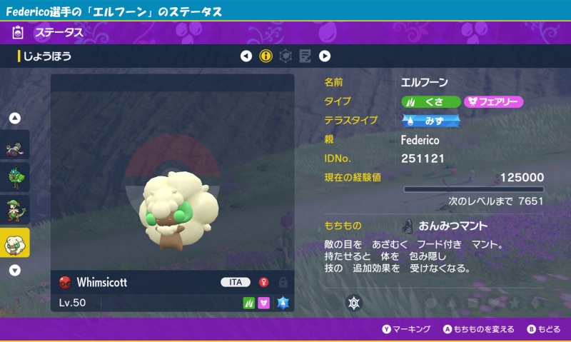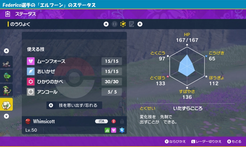 エルフーンの個体値は5V、努力値はH252・B54・D204に振られています。育成済みの個体なので、対戦環境にすぐに連れていくことができます。