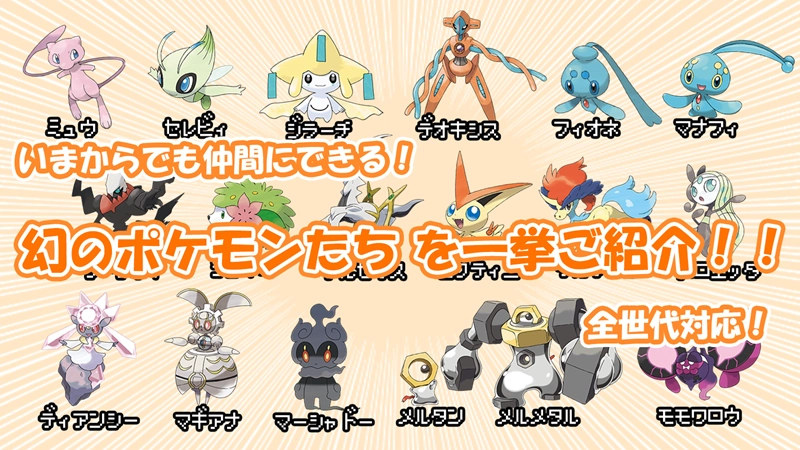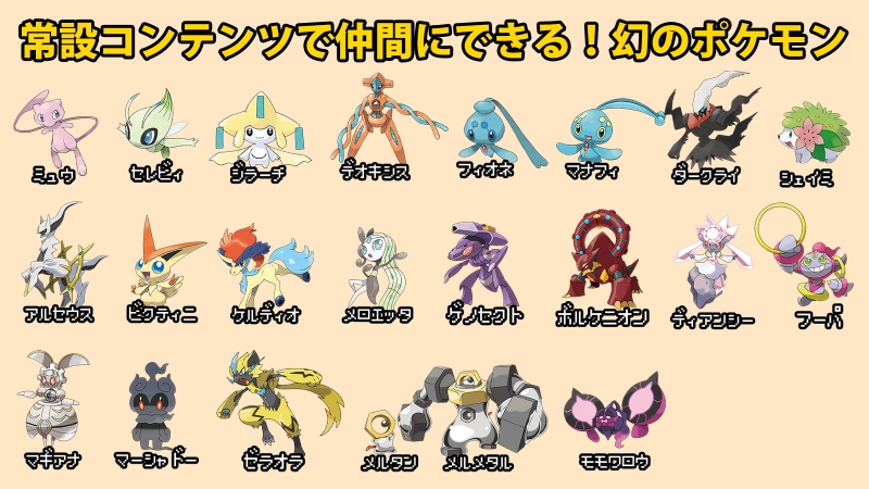 2025年12月時点で、全世代の常設コンテンツで【ミュウ】【セレビィ】【ジラーチ】【デオキシス】【フィオネ】【マナフィ】【ダークライ】【シェイミ】【アルセウス】【ビクティニ】【ケルディオ】【メロエッタ】【ゲノセクト】【ボルケニオン】【ディアンシー】【フーパ】【マギアナ】【マーシャドー】【ゼラオラ】【メルタン】【メルメタル】【モモワロウ】の22種類の幻のポケモンを仲間にできます。