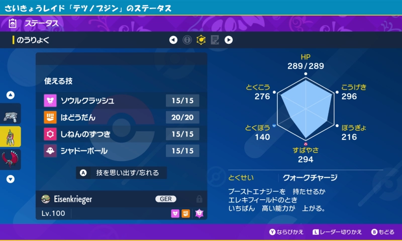 テツノブジンは、「エレキフィールド」「ソウルクラッシュ」「しねんのずつき」「はどうだん」「シャドーボール」「つるぎのまい」などを使ってきます。
