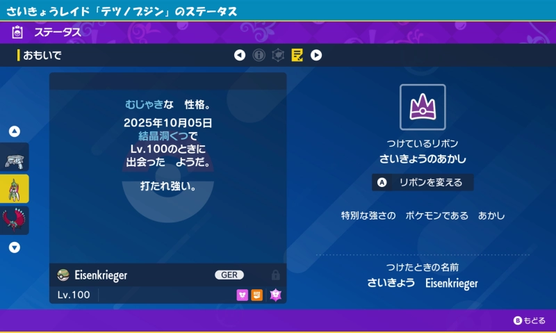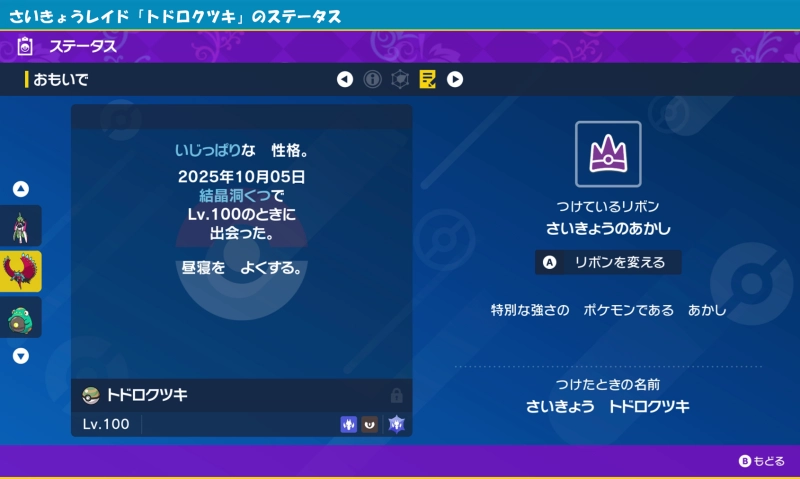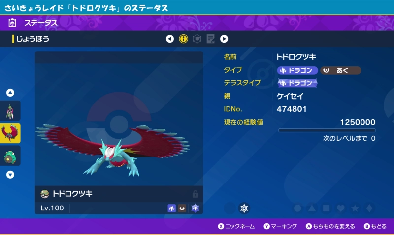 今回のさいきょうレイドは、セーブデータひとつにつき、「テツノブジン」または「トドロクツキ」のいずれか、1匹しかゲットできない仕様です。
