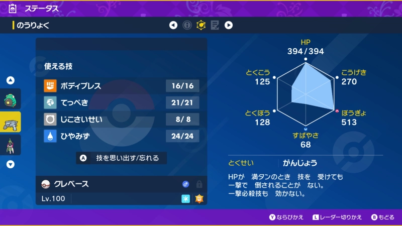 • バフが解除された場合は「じこさいせい」で回復しつつ、「てっぺき」を3回積む