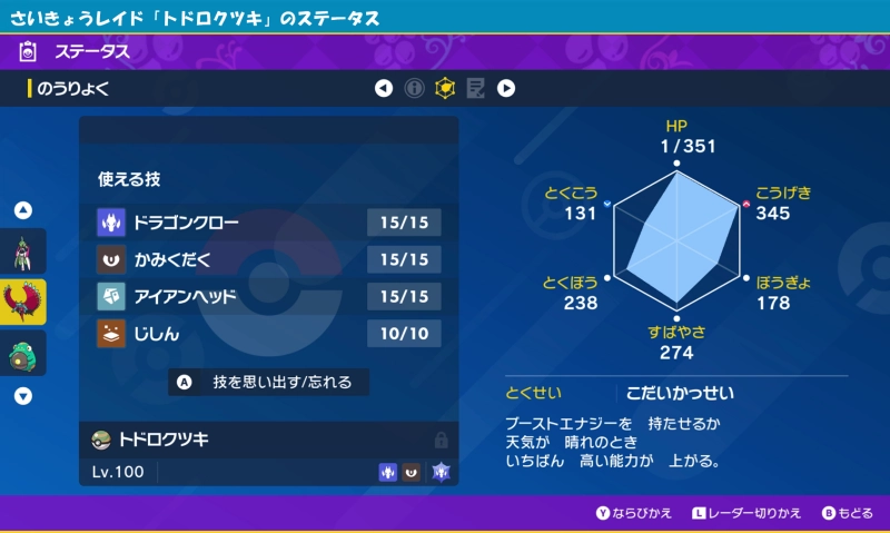 トドロクツキは、「にほんばれ」「ドラゴンクロー」「かみくだく」「アイアンヘッド」「じしん」「りゅうまい」などを使ってきます。